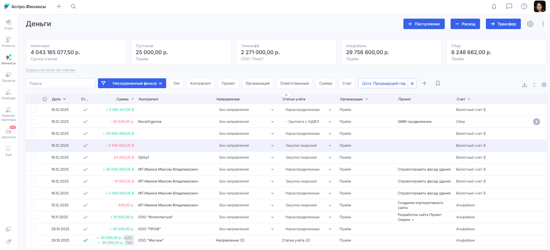 В одном окне собраны все счета компании с актуальными остатками в режиме реального времени. Система автоматически загружает выписки из банка и позволяет добавлять операции вручную. Финансовый директор получает единый реестр операций без необходимости заходить в каждый банк отдельно.