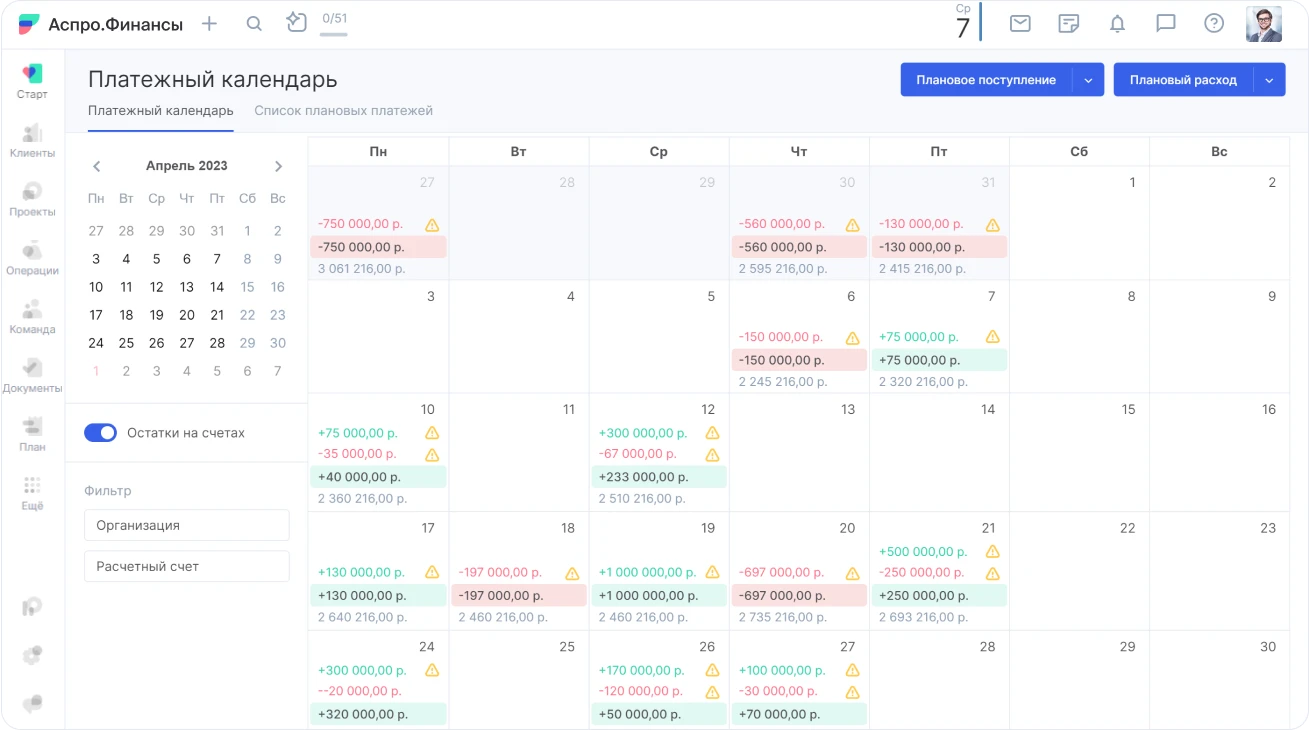 Календарь фиксирует все плановые платежи: налоги, зарплату, предоплаты, таможенные платежи. Инструмент позволяет: