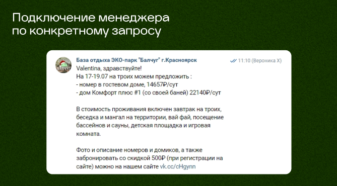 Мы отказались от прямого ведения трафика на сайт и внедрили чат-бот ВКонтакте как промежуточный этап между рекламой и бронированием. Бот знакомил пользователя с базой без участия менеджера и сразу на той площадке, где произошло первое касание (Вконтакте):