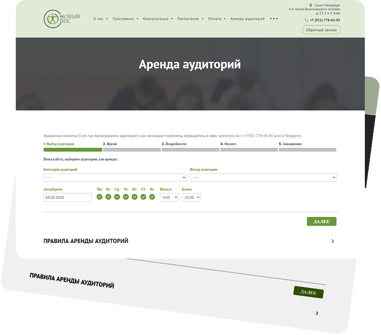 Сайт стал не просто визиткой, а рабочей платформой — с онлайн-бронированием аудиторий, интеграцией оплаты, структурированным расписанием и фильтруемыми отзывами. Это эффективный маркетинговый инструмент, который способствует росту продаж и поддержанию удобной коммуникации с аудиторией.