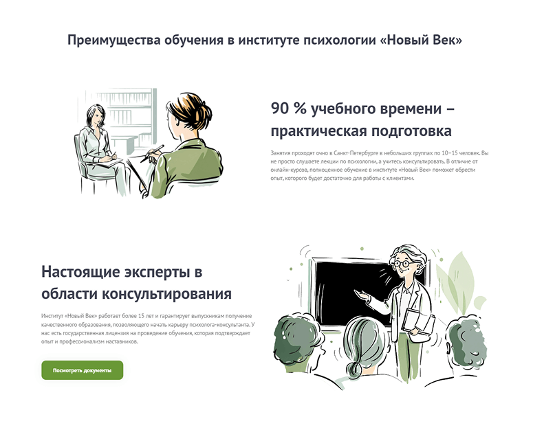Цветовая палитра. Новый сайт выдержан в спокойной, доверительной гамме: основа – чистый белый фон, акценты – в оттенках мягкого зелёного и светло-серого. Такая палитра создаёт ощущение профессионализма, стабильности и психологического комфорта, идеально соответствующее тематике образовательного учреждения. Все элементы – от кнопок до иконок – выдержаны в единой цветовой системе.