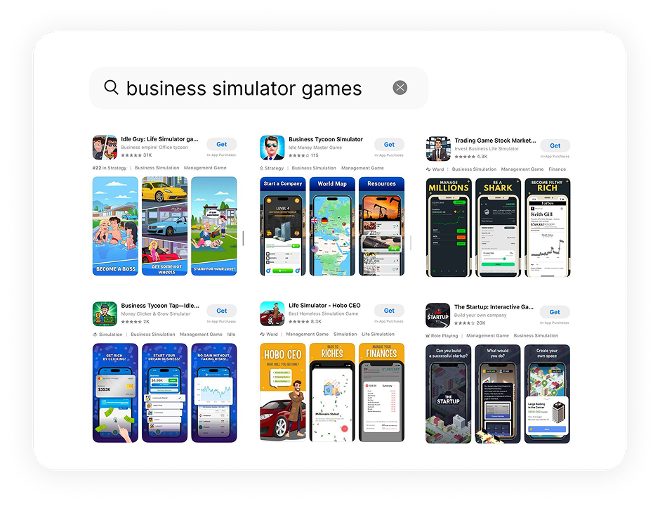 Выяснилось, что по многим общим и узким запросам в поисковой выдаче конкурируют разные типы бизнес-стимуляторов. Одни сосредоточены на инвестировании и фондовых рынках, другие совмещают элементы симуляции жизни и предпринимательства, третьи посвящены конкретным видам бизнеса.