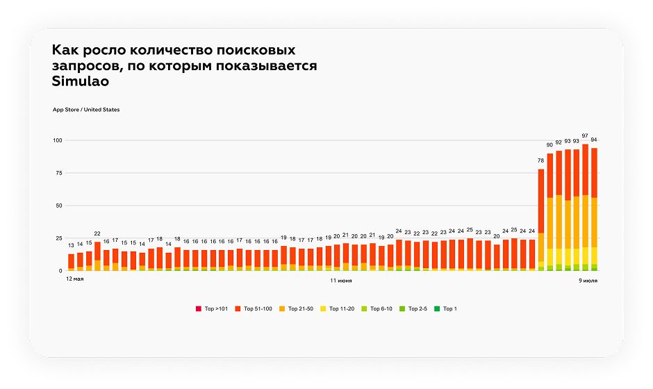 Приложение клиента индексировалось по 13–25 поисковым запросам, причём почти по всем находилось в топ 51–100. Это значит, Simulao было сложно найти в поиске, и оттуда игра получала мало органического трафика.