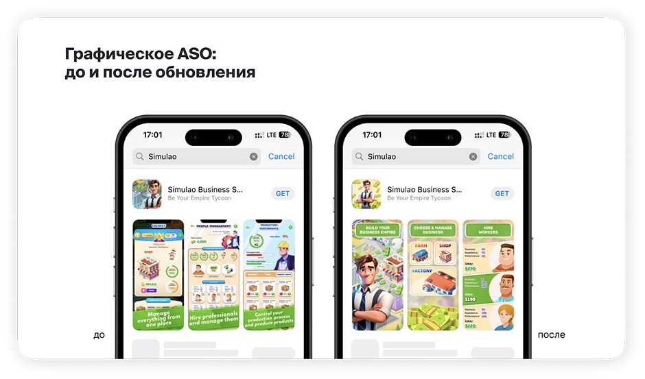 При этом графика на странице Simulao проигрывала конкурентам. Порядок скриншотов не давал чёткого понимания механик игры, а сами скриншоты казались перегруженными из-за обилия надписей и элементов интерфейса. Всё это могло запутать потенциального пользователя и снижать конверсию в установку. Поэтому мы рекомендовали обновить не только текстовые, но графические метаданные, чтобы улучшить результаты оптимизации.