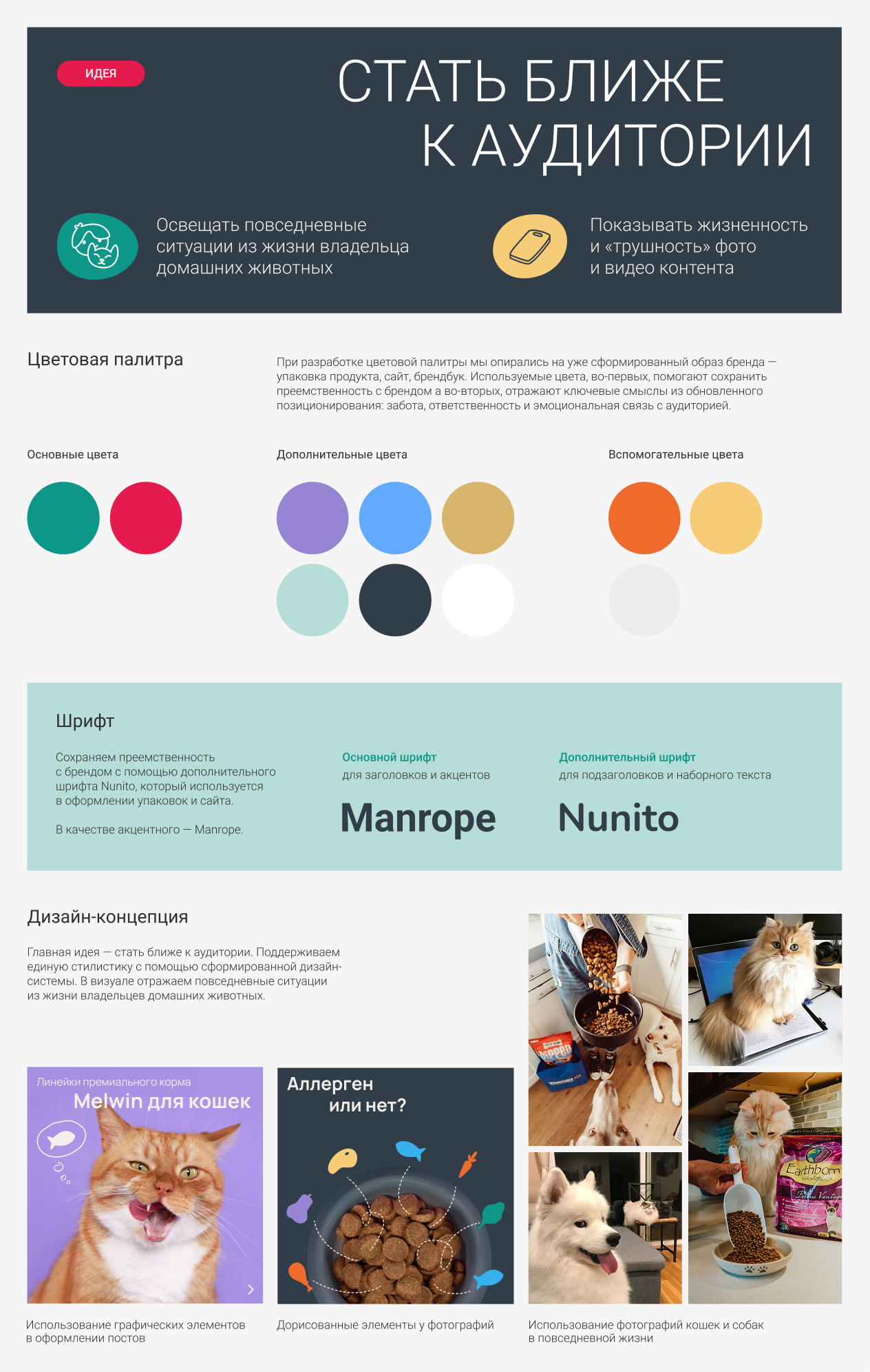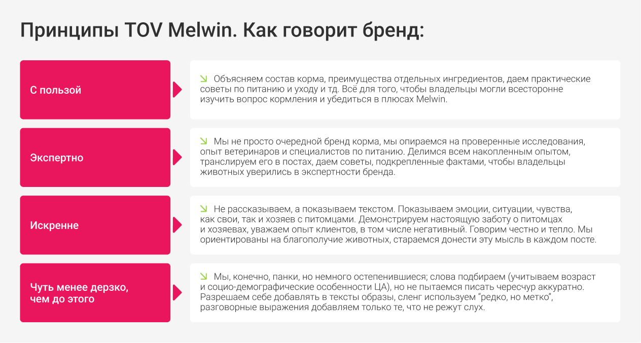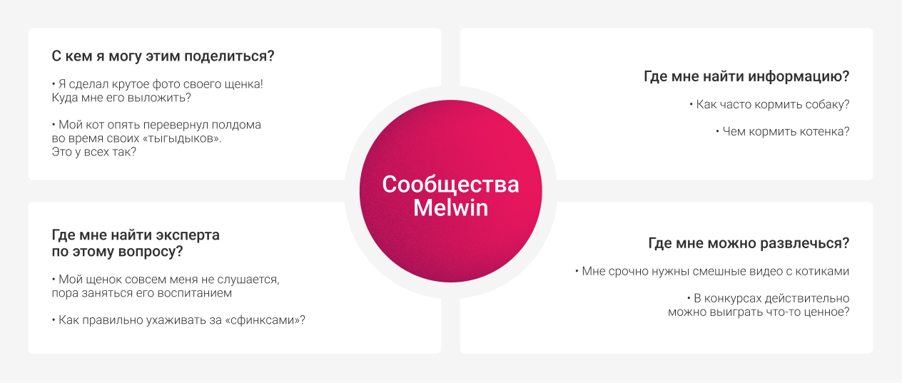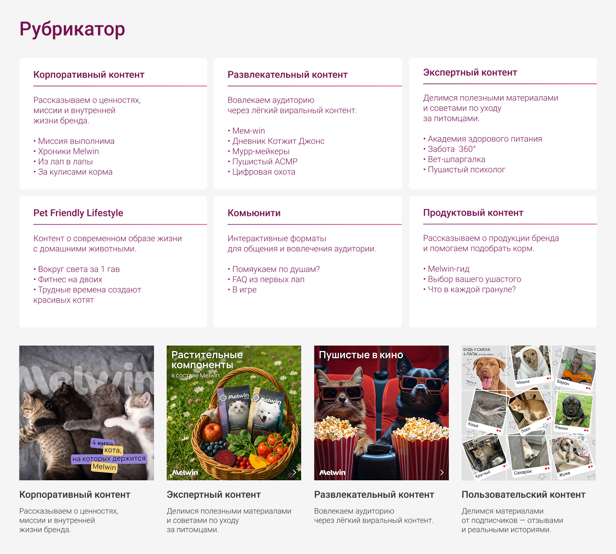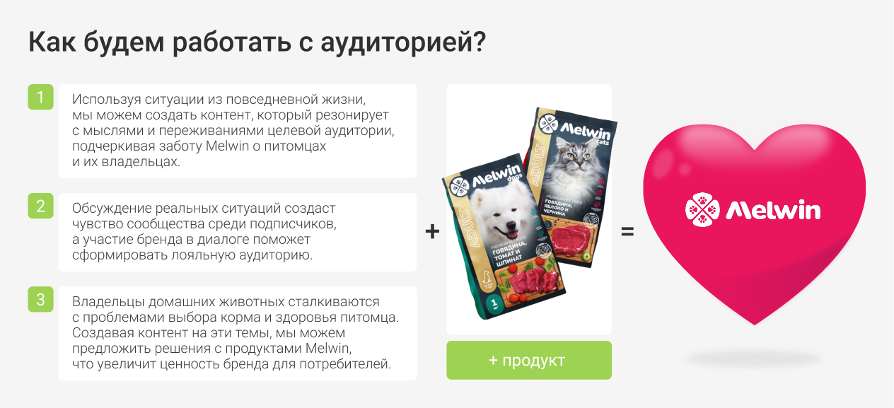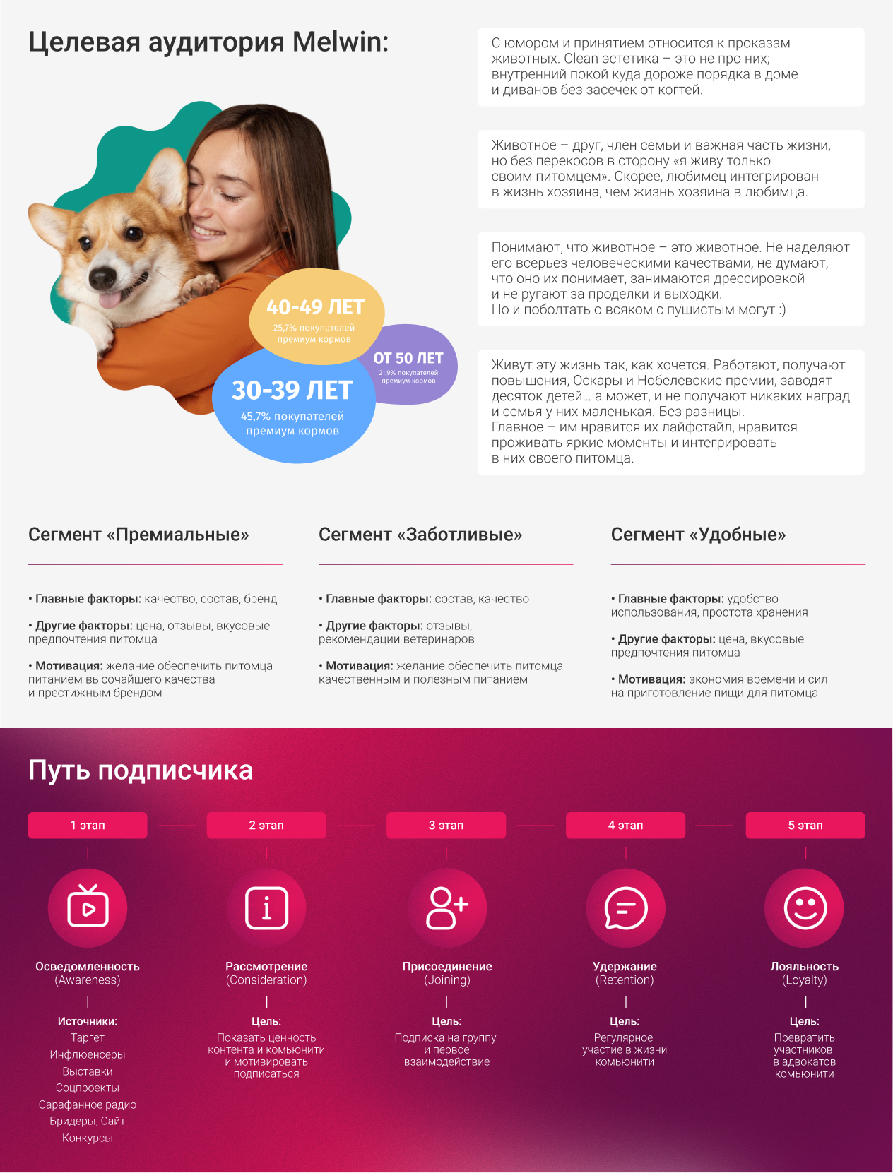 Начали с главного — целевой аудитории. Обновили аватары ЦА и построили путь пользователя от первого касания до лояльности. Аудитория Melwin — владельцы кошек и собак 30–49 лет, которые видят в питомце члена семьи. Это помогло настроить контент под их интересы.