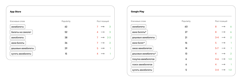 В конце июля заметили просадку по одному из самых частотных запросов — «Купить авиабилеты». Чтобы стабилизировать ситуацию, усилили кампанию: за короткий срок привлекли 300 мотивированных установок. Это дало нужный импульс — приложение вышло на первое место по этому запросу.