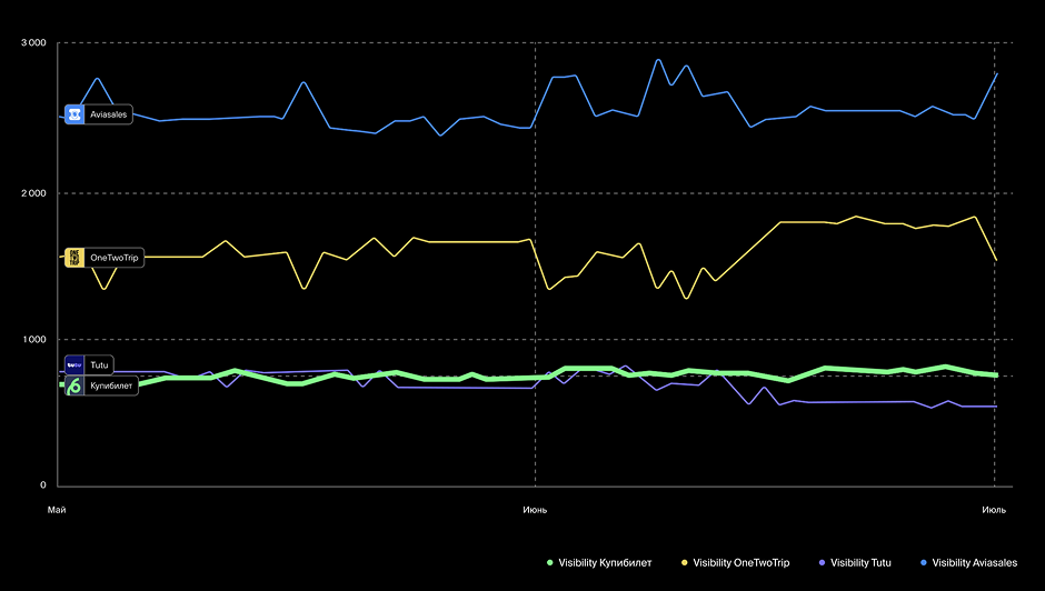 Для разработки действенной стратегии мы совместно с командой продукта провели комплексное исследование. Проанализировали динамику спроса в нише, оценили видимость и количество установок у приложений конкурентов и сравнили их с показателями «Купибилета».