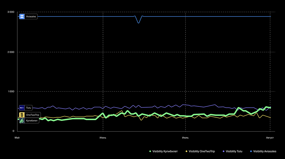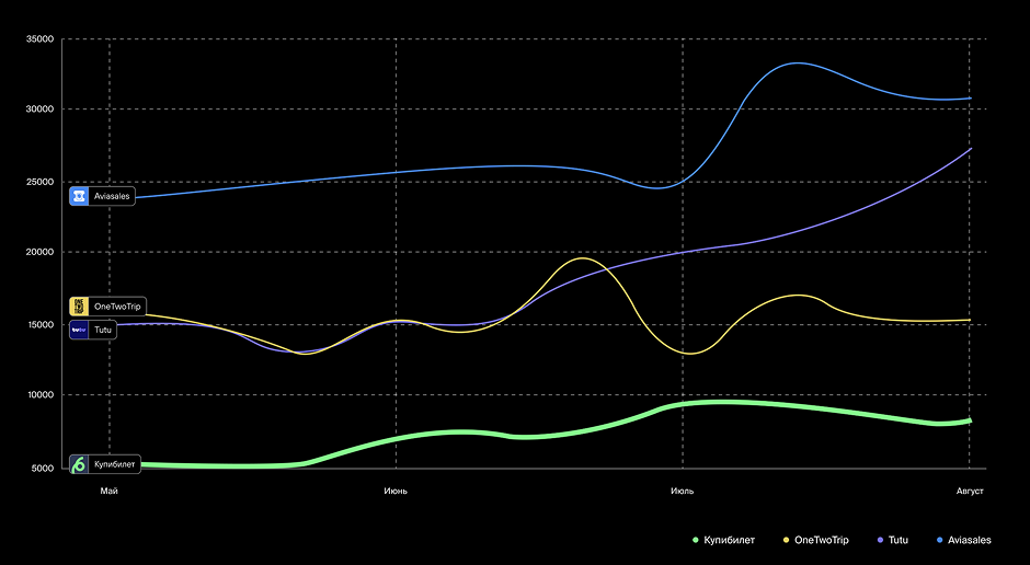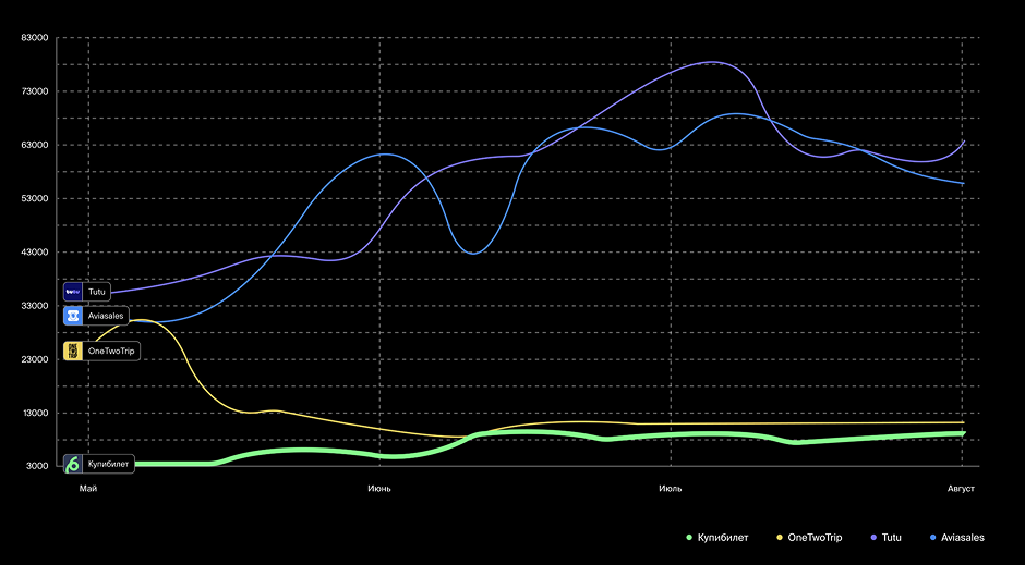 Для разработки действенной стратегии мы совместно с командой продукта провели комплексное исследование. Проанализировали динамику спроса в нише, оценили видимость и количество установок у приложений конкурентов и сравнили их с показателями «Купибилета».