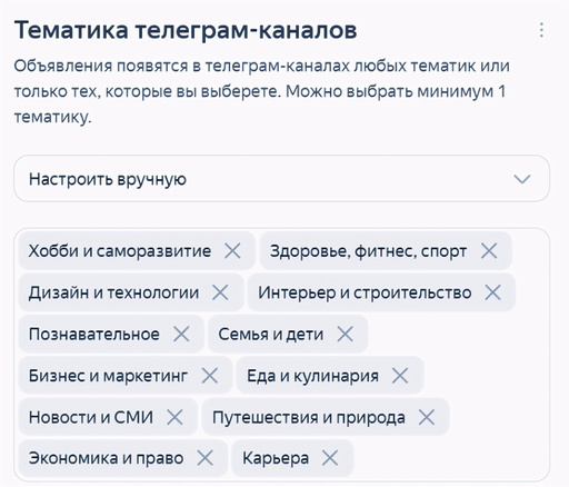 В данном проекте мы вели показы в телеграм-каналах через Яндекс Директ, тематики каналов для показа отобрали по интересам: