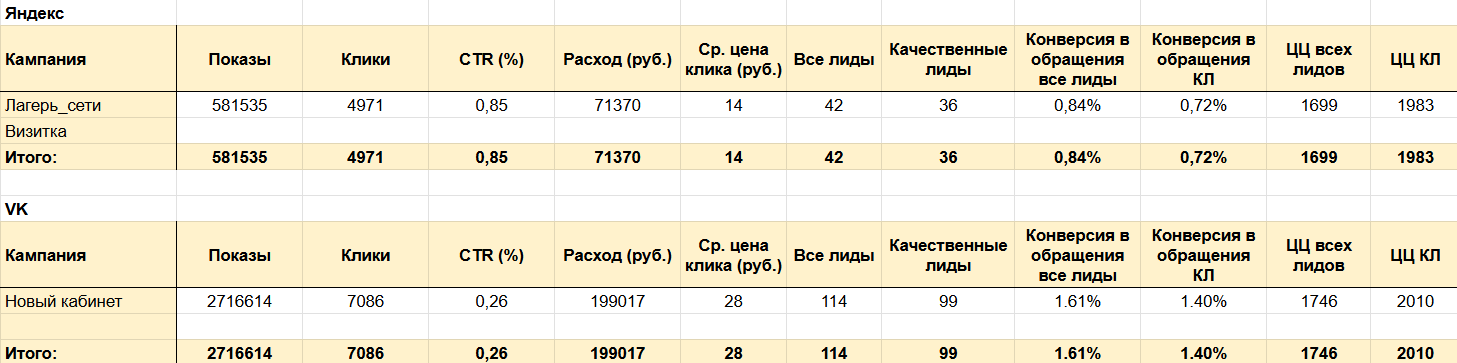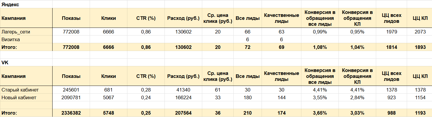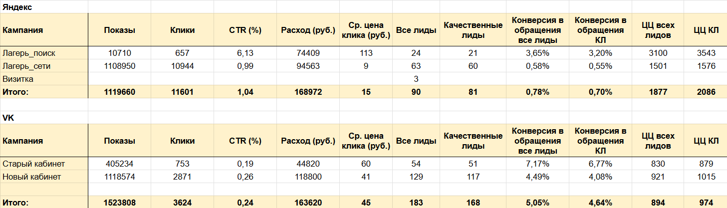В конце мая по обратной связи от клиента выяснилось, что лиды, полученные через старый рекламный кабинет ВКонтакте, хуже конвертируются в фактические продажи (оплату места в лагере).
