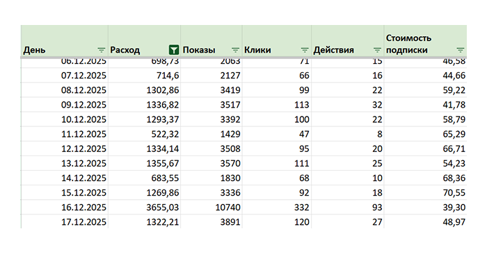 Все решения принимались по цифрам из ежедневного отчета: расход, показы, клики, действия и стоимость подписки. Мы смотрели динамику стоимости подписки по дням и не масштабировали бюджет вслепую, пока не видели стабильные результаты.