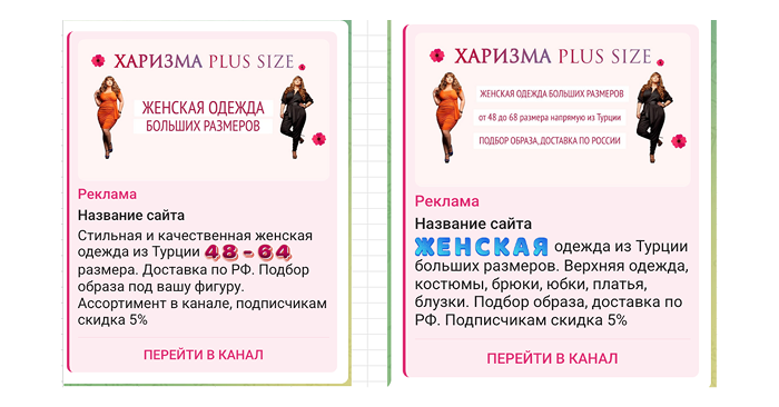 «Харизма Plus Size» — это Telegram-канал с женской одеждой больших размеров, с доставкой по России. Проект работает в B2C формате и продвигается через Telegram Ads с размещением в тематических каналах.