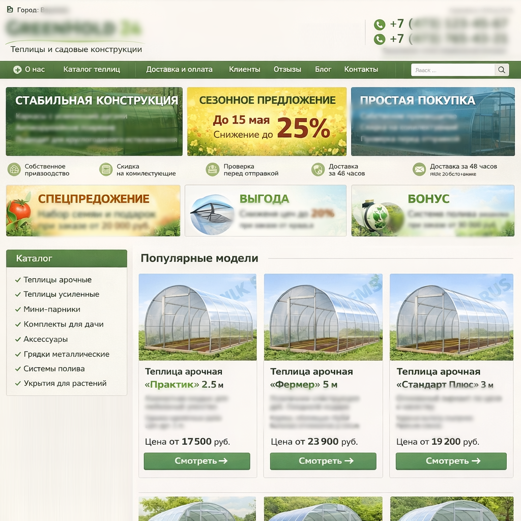 Сайт выглядел как тысячи других в нише. «Теплицы. Купить. Доставка по России». Никакого рассказа о продукте, никаких аргументов, никакой истории. Просто ещё один сайт с теплицами.