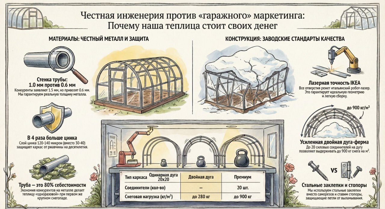 Это история о заводе, который производит по-настоящему хорошие теплицы. Более 200 человек на производстве. Усиленный металл, утолщённый профиль, двойные дуги, сокращённый шаг между ними. Каждая деталь продумана так, чтобы конструкция служила десятилетиями, а не сложилась после первой снежной зимы.