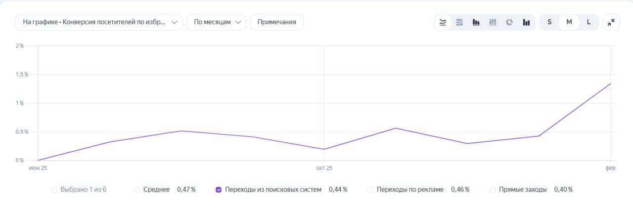 Конверсия из органического поиска выросла с 0,35% до 1,3% — почти в четыре раза. Это произошло не за неделю: рост был постепенным, по мере того как обновлённые страницы индексировались и набирали поведенческую историю.