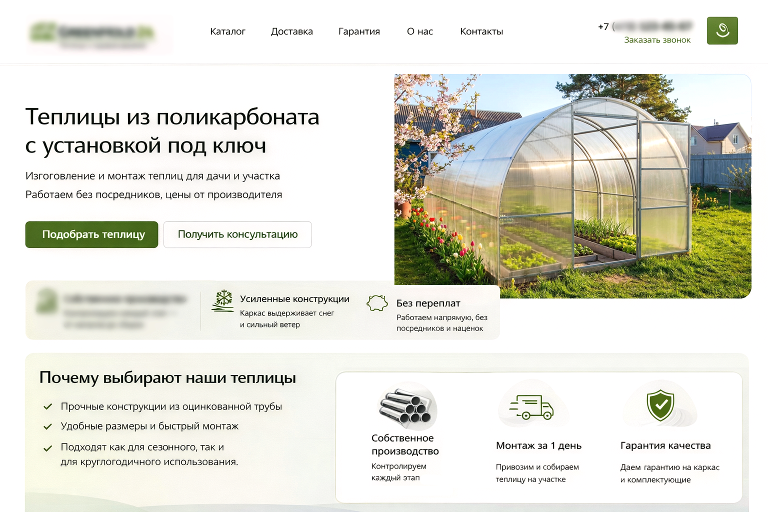Социальные доказательства — отзывы и фото реальных теплиц в эксплуатации — появились там, где покупатель принимает решение, а не спрятались в конце страницы.