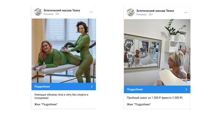 Тексты в объявлениях писались от лица специалиста студии, с заботой и экспертностью, делая акцент на том, что LPG — это безболезненно, эффективно и доступно по акции.
