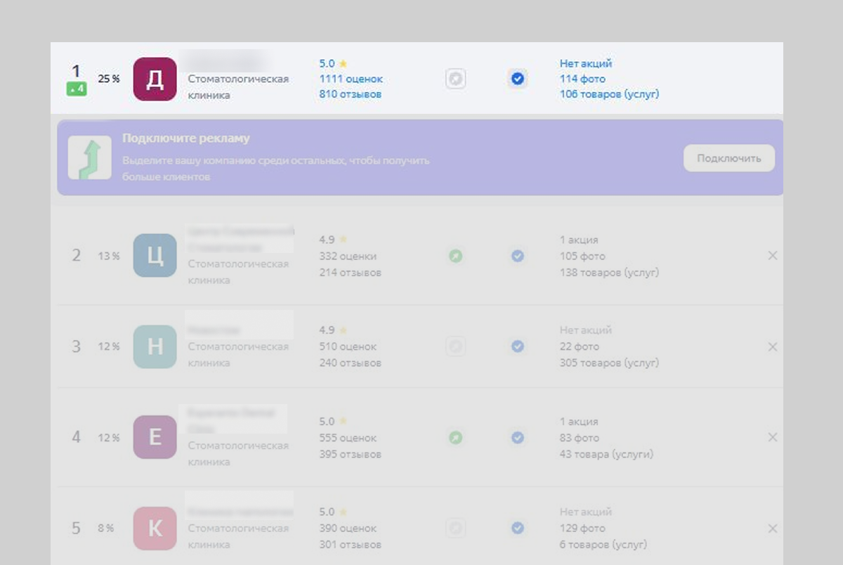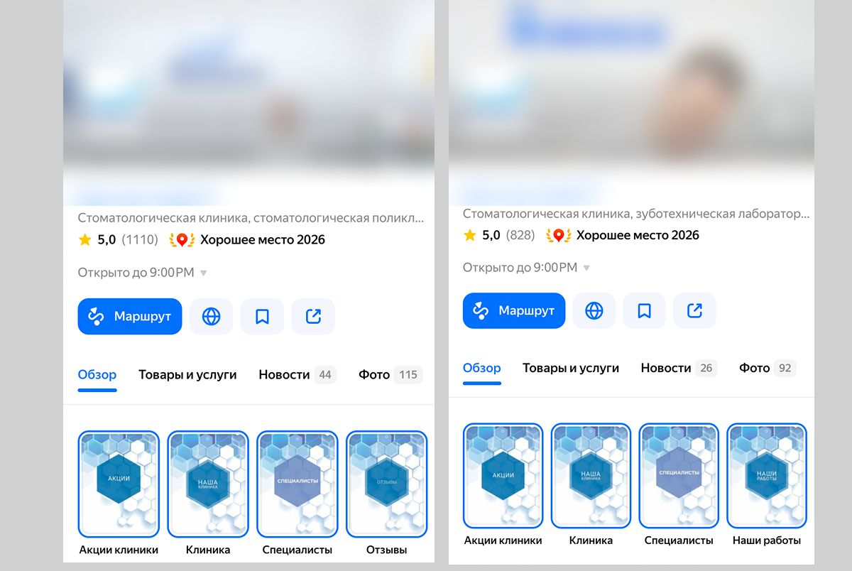 Параллельно анализировали действия прямых конкурентов: фиксировали частоту обновления профилей, смотрели на количество и свежесть отзывов, отслеживали полноту заполнения разделов. Так мы быстро находили, где мы слабее, и подтягивали именно те места, где клиника уступала соседям.