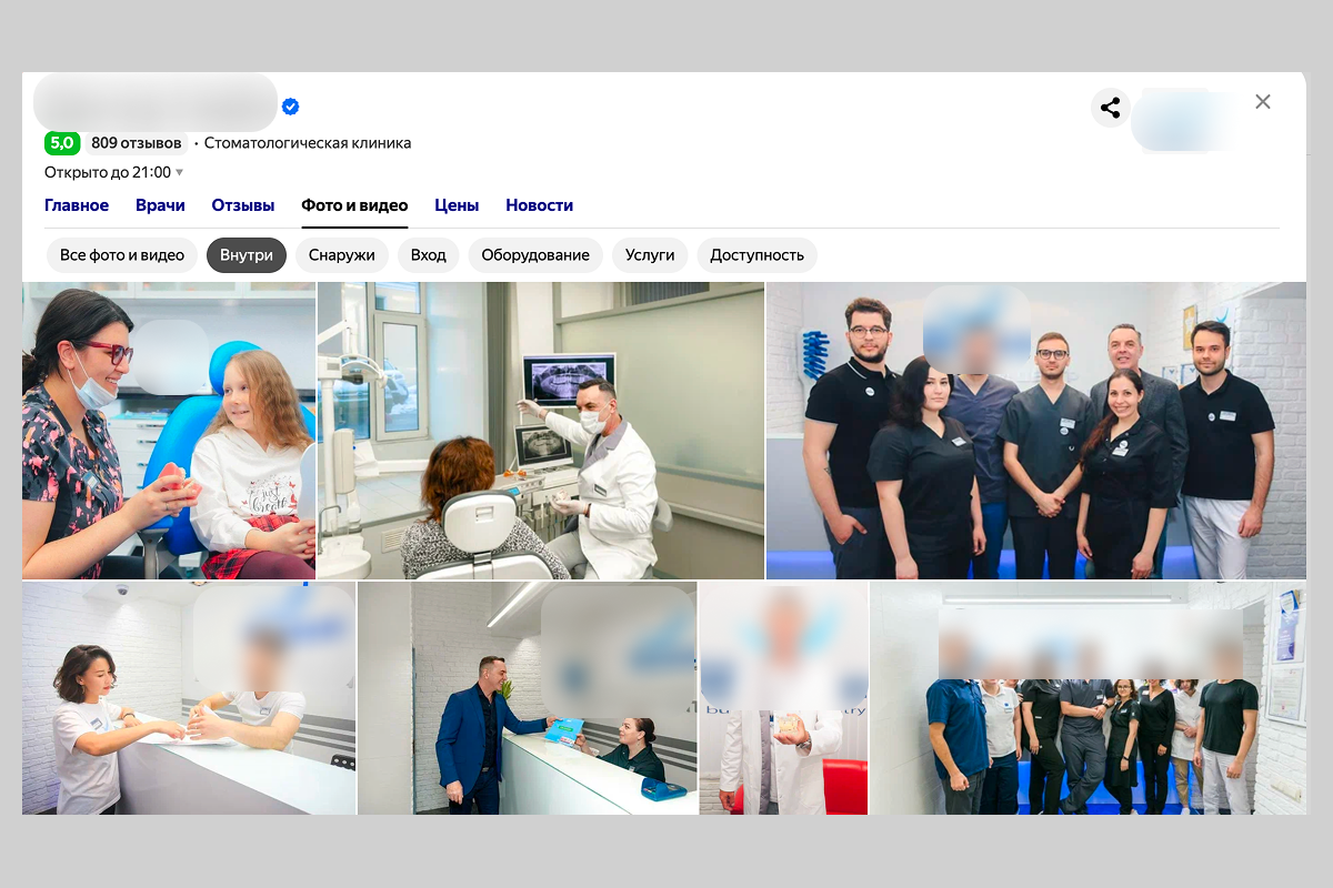 Системно обновляли фотоальбомы: снимали интерьеры, оборудование, врачей в работе, примеры лечения. В свойствах каждого фото прописывали ключевые слова, и это помогло ранжированию.