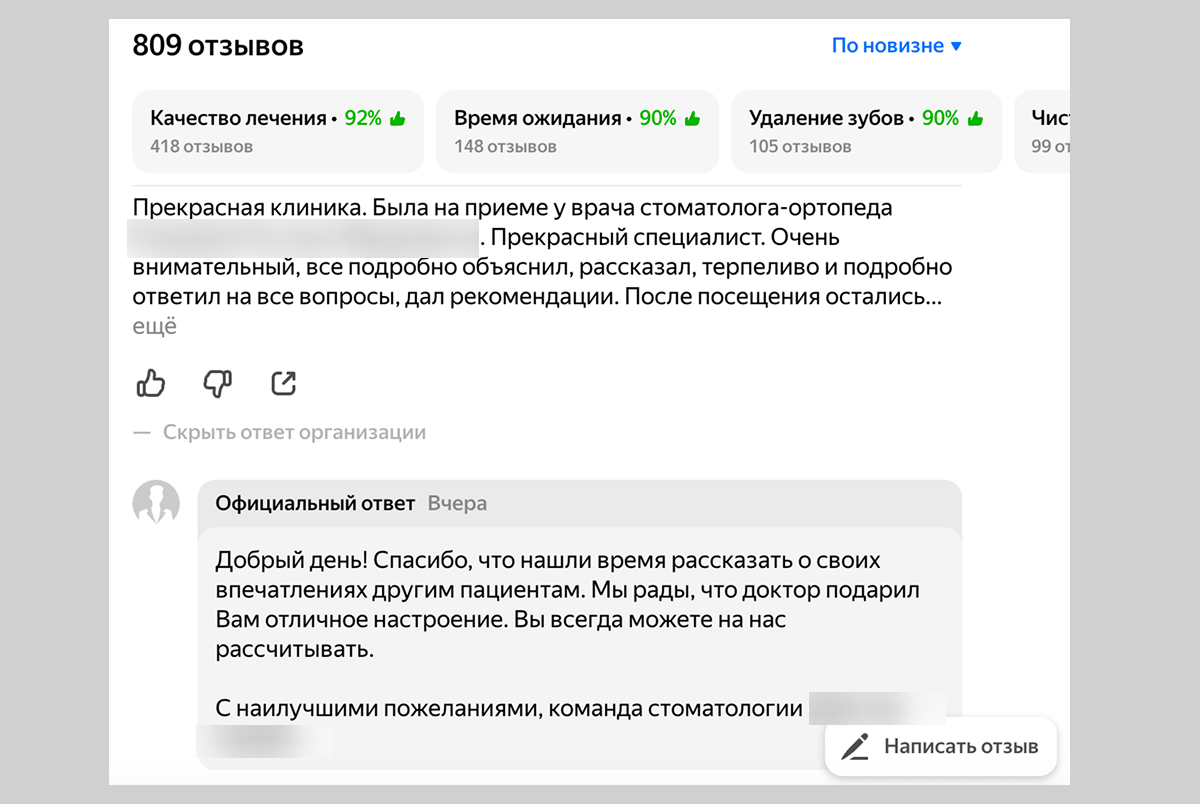 Мы прописали единые правила общения с пациентами в карточках: утвердили стиль ответов, договорились, какие формулировки можно использовать и как переводить спорные вопросы в личку. Также сделали готовые шаблоны для ответов на положительные и отрицательные отзывы — так мы ускорили обработку обращений и снизили юридические риски.