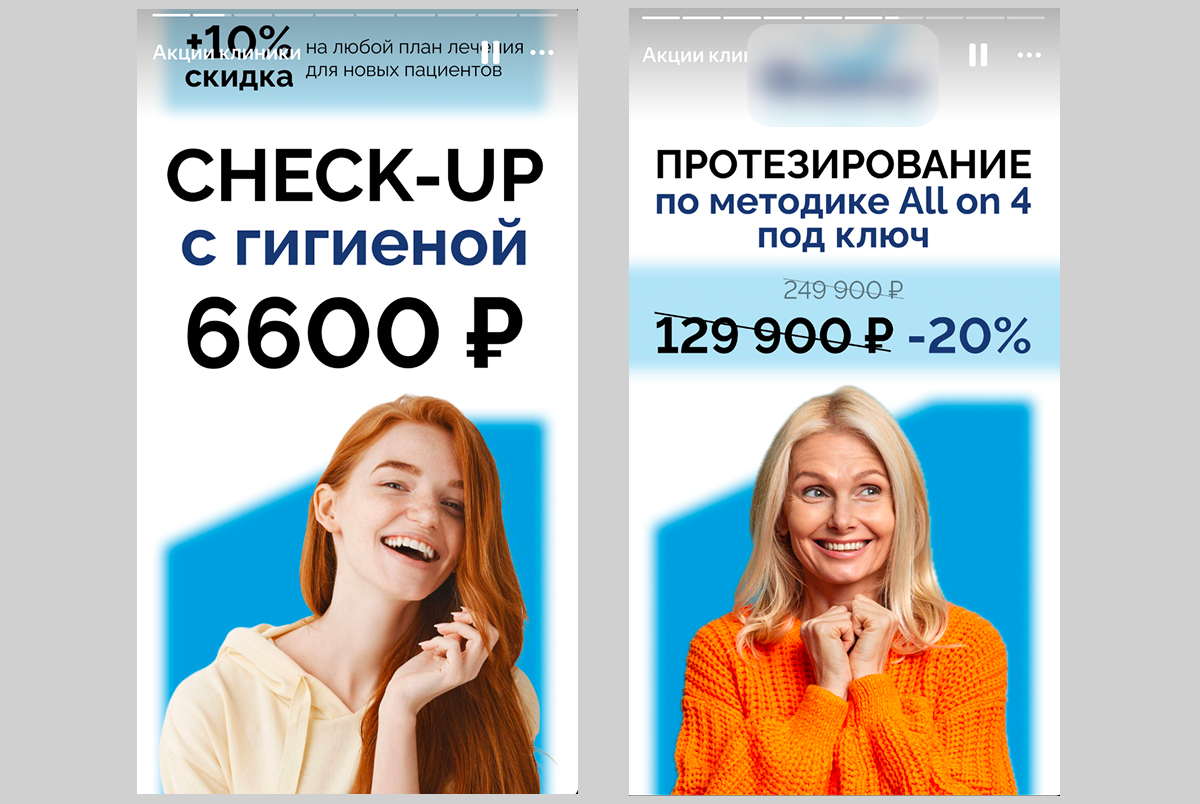 Добавили «Истории» — короткие видеоролики, которые показывают атмосферу клиники и укрепляют доверие аудитории. Поставили кнопки для быстрого перехода на сайт и записи на прием.
