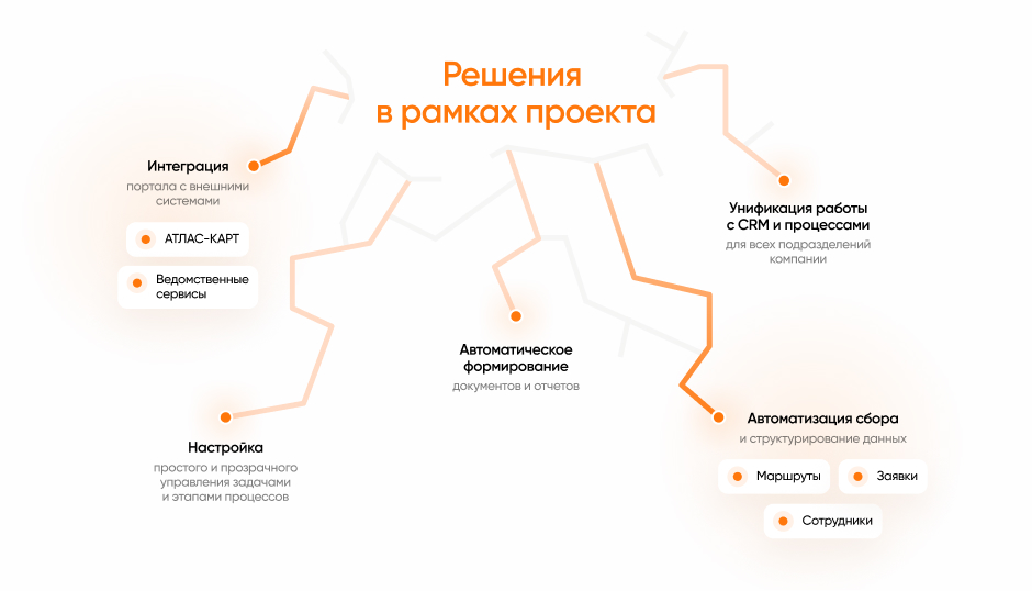 Одной из задач при настройке портала стала интеграция с системой АТЛАС-КАРТ для управления маршрутами выездных сотрудников.