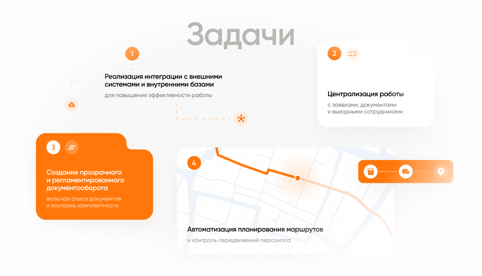 В рамках проекта был настроен процесс передачи данных из CRM для подачи заявлений, получения лицензий, учета транспортных средств и подготовки официальных запросов.