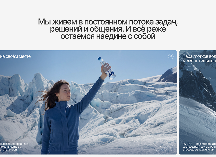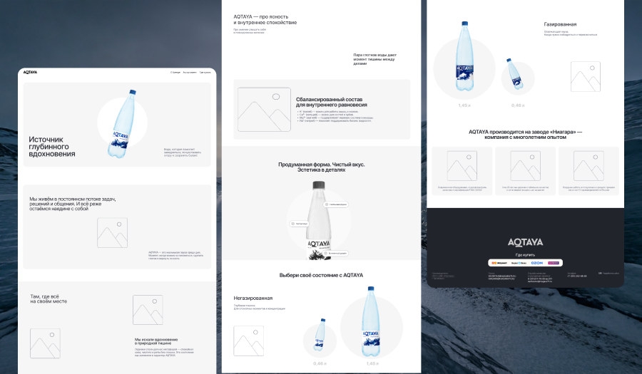 В результате у бренда воды AQTAYA появился имиджевый сайт, который раскрывает философию продукта и позволяет рассказать о нем гораздо глубже, чем это возможно на общем сайте производителя.