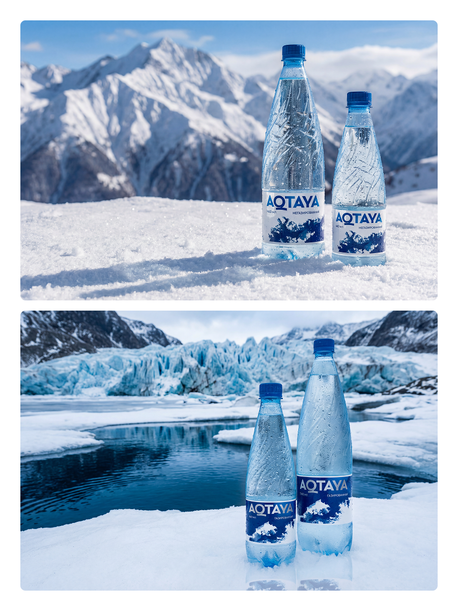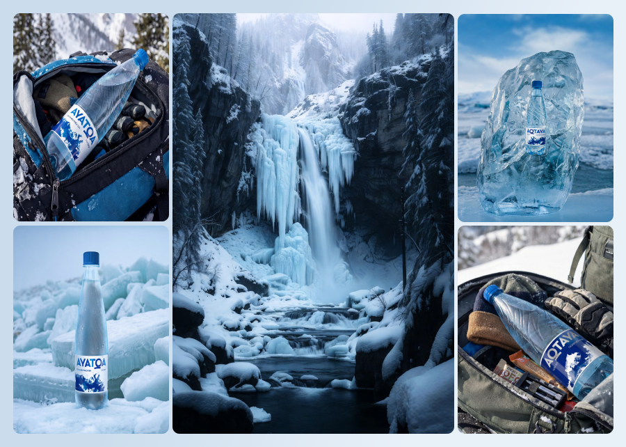 Визуальный акцент сделали на бутылке, погруженной в ледяную глыбу. Холодный свет и прозрачные грани льда создают ощущение чистоты и свежести. Бутылка выглядит так, будто только что появилась из глубины ледника. Такой образ сразу окунает в атмосферу спокойствия, тишины и природы.