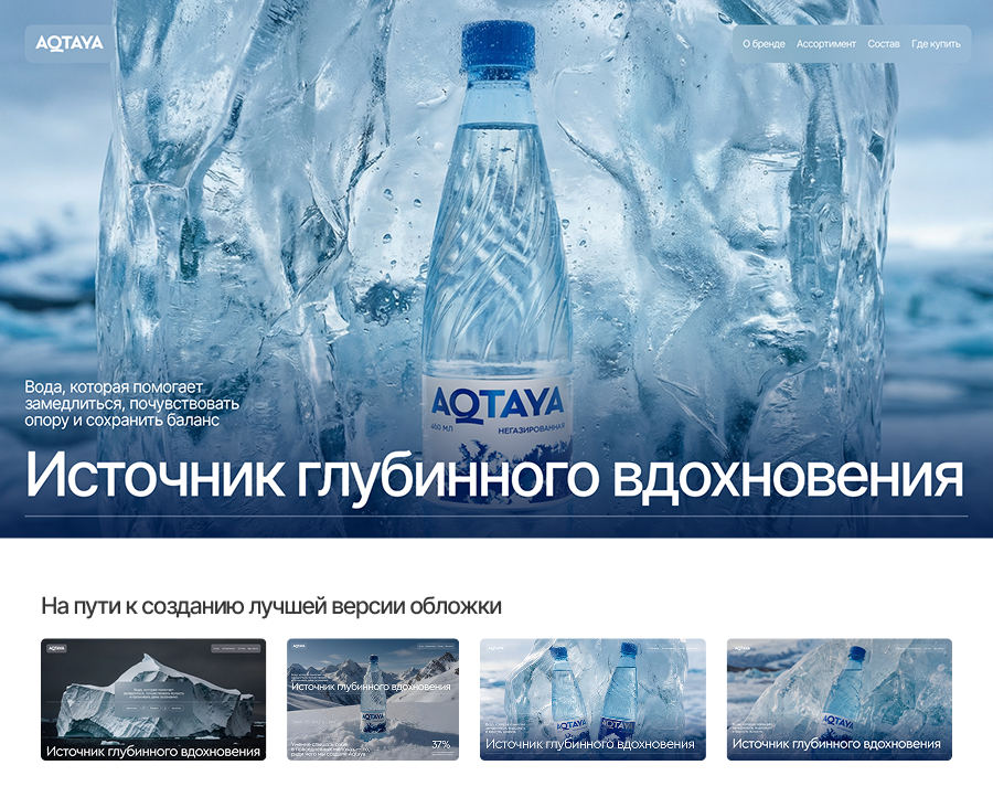 Особенность проекта в том, что практически все изображения на сайте сгенерированы. Они помогли создать целостный визуальный язык и передать ценности бренда воды AQTAYA: спокойствие, баланс, ощущение чистоты и внутреннего вдохновения.