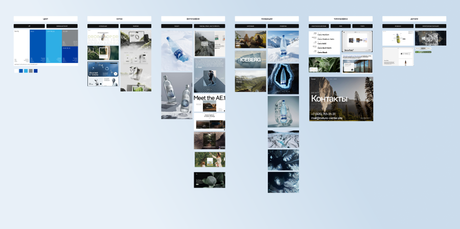 Из исходных материалов заказчик прислал ТЗ, презентацию компании и изображения двух бутылок воды в разных объемах. Также нам передали фирменные цвета и логотип во всех вариантах. Цвета из брендбука в итоге решили не использовать, для этикетки они работают хорошо, но на сайте выглядели бы слишком простыми.