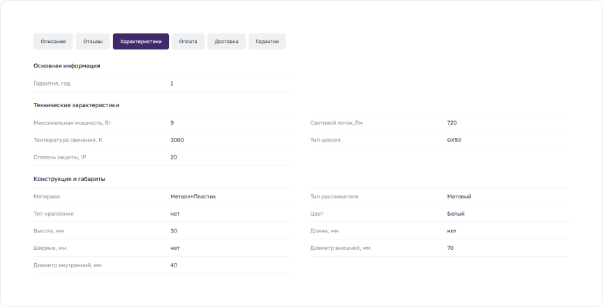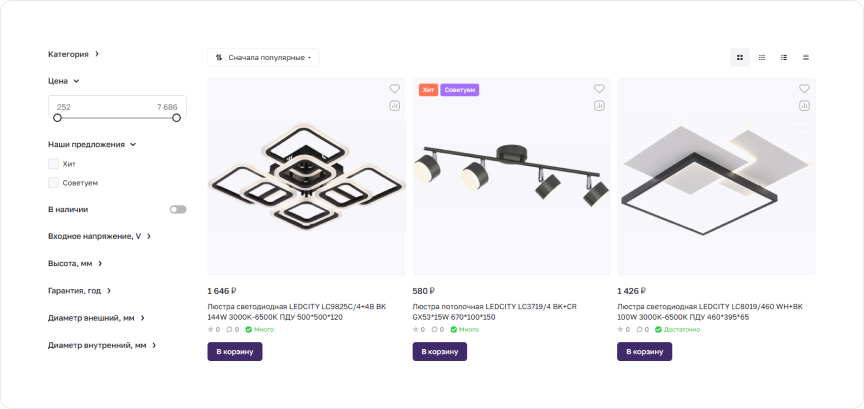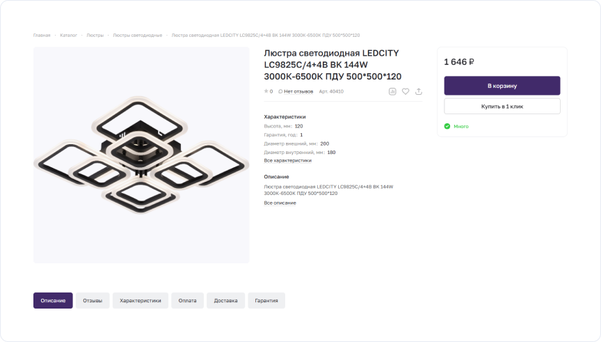 Особое внимание уделили каталогу. Реализовали фильтрацию по характеристикам, настроили отображение товаров и добавили данные об остатках. В карточке товара сгруппировали характеристики и разместили информацию о доставке, оплате и гарантии.