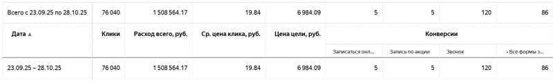 Санкт-Петербург продемонстрировал более высокую эффективность в сравнении с Москвой. Стоимость клика ниже на 31% (13,66 против 19,84 рублей), количество конверсий при сопоставимом расходе выше в 3,7 раза. Причина — меньший уровень конкуренции в регионе при сопоставимом спросе на услуги лазерной медицины.