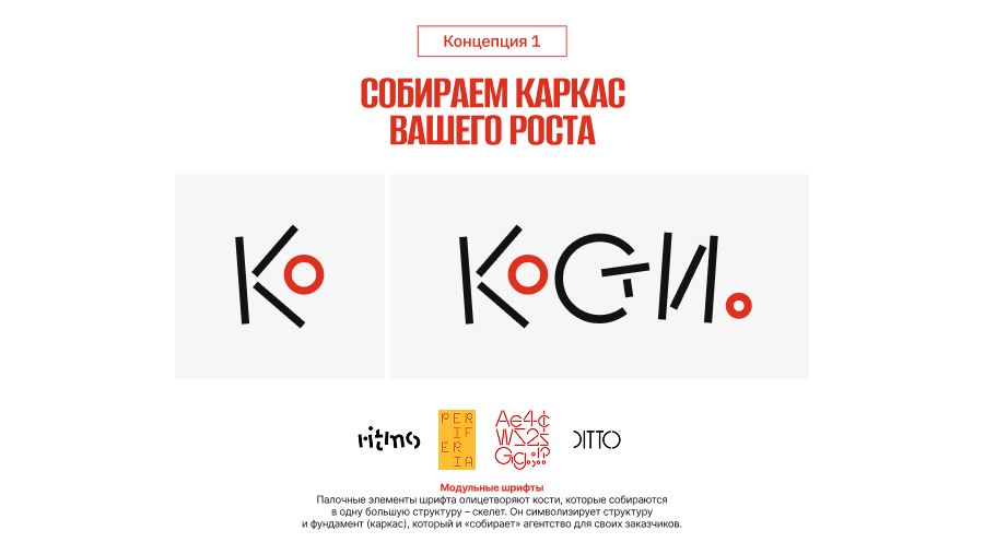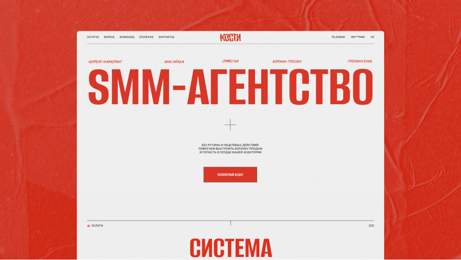 Логика простая, «Кости» — это основа. Сначала мы выстраиваем «скелет»: аудит, стратегия; а дальше на него нанизывается «мясо»: контент и продвижение. Графически идею передали через модульный шрифт, собранный из простых элементов, как каркас из костей.