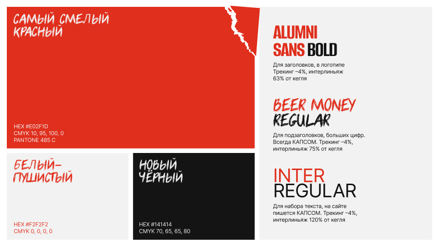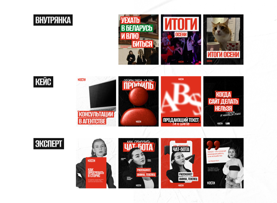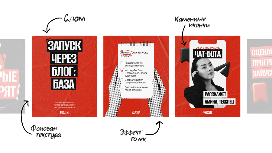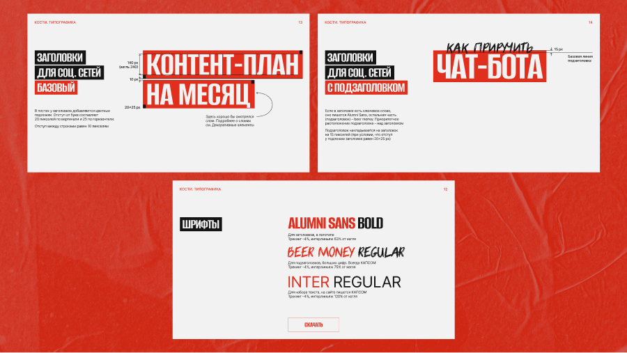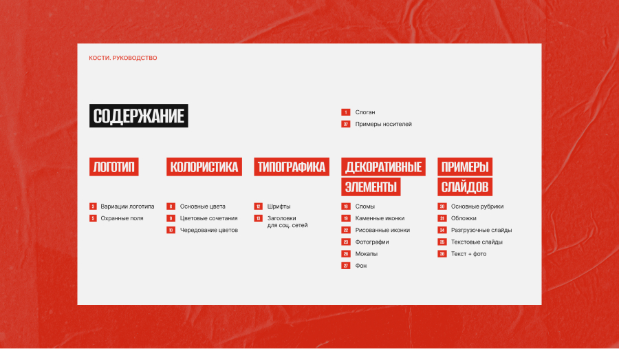 С помощью фирменного стиля удалось передать позиционирование — каждый элемент работает на общую задачу. Яркие контрастные цвета, сломы в заголовках, рваные края фотографий, фактурные фоны и разнообразие — все это создает смелый образ с характером «контента на костях».