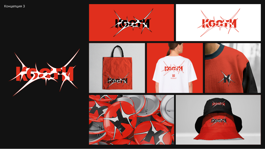 Но по ощущениям ни один из вариантов не попал в нужный градус. Они получились недостаточно жесткими и брутальными. Маша прислала дополнительные референсы, и стало понятно: метафора в логотипе должна быть более буквальной и резкой.