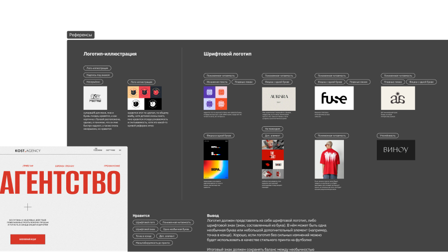 Маша прислала порцию референсов, с комментарием, что именно нравится. Мы их проанализировали и разделили на две категории: логотип-иллюстрация и шрифтовой логотип. Для каждого примера выстроили систему тегов, чтобы видеть повторяющиеся приемы.