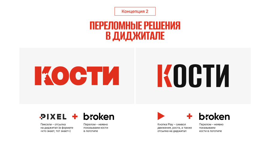 Про смелость и про то, что агентство приносит в бизнес новое, ломая барьеры роста. Графически это подчеркнули через сломанную букву «К» и вшили отсылки через «слом». В первом варианте, где слом, передали отсылку к пикселю, во втором, где контрформа, к кнопке «Плей».