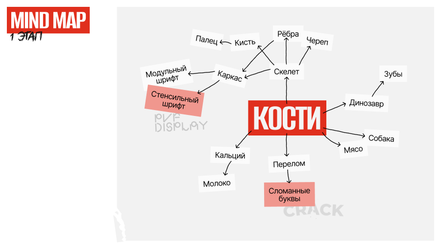 Дальше построили майнд-карту от слова «кости», выстраивая цепочки ассоциаций. Искали образы, которые можно упрощенно представить через графические элементы.