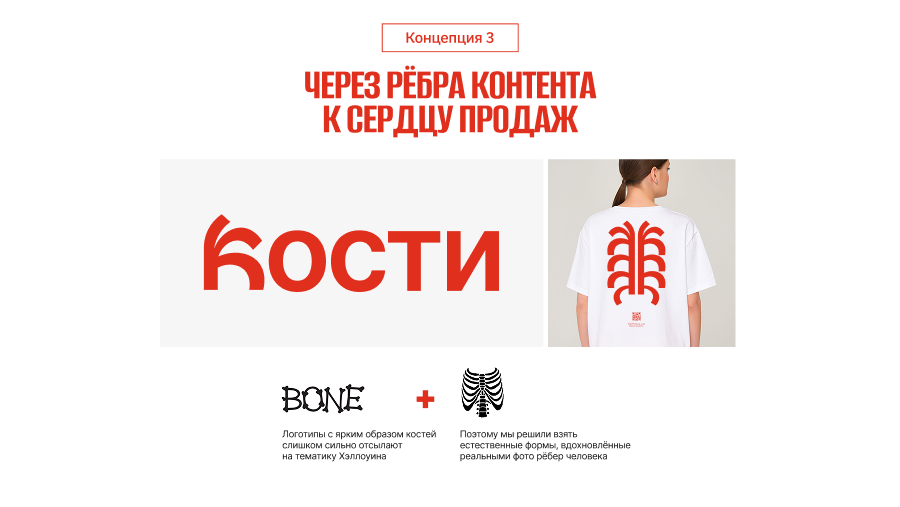 Метафора про то, что мы создаем продажи с помощью контента. Контент — ребра, которые защищают бизнес от спада прибыли и обеспечивают рост продаж одновременно. В логотипе появились те самые «ребра», а форма буквы — намеренно естественная. Эта идея отлично ложилась на принты и мерч.