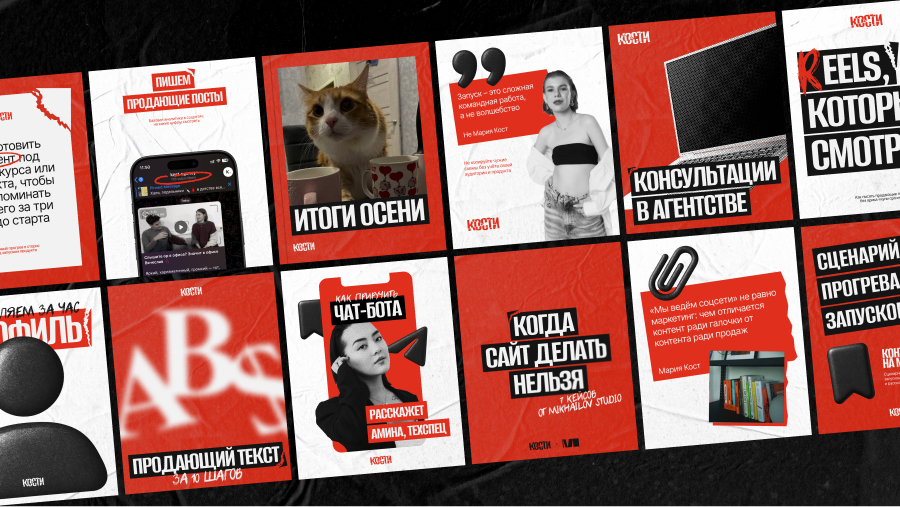 В результате агентство «Кости» получило мощный визуальный инструмент, который выделяет их на фоне нейтральных или строгих конкурентов, создает узнаваемость и легко масштабируется на любые носители — от баннера до мерча.