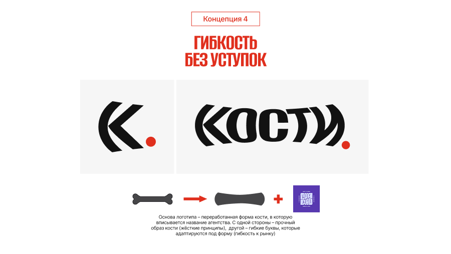 Идея построена на противоречии: агентство гибкое для своих клиентов, но бескомпромиссное по качеству работы. В позиционировании «без уступок» — прочность агентства, ее показали через материал — упрощенную форму кости. А гибкость показали с помощью букв, которые искажаются по форме кости.