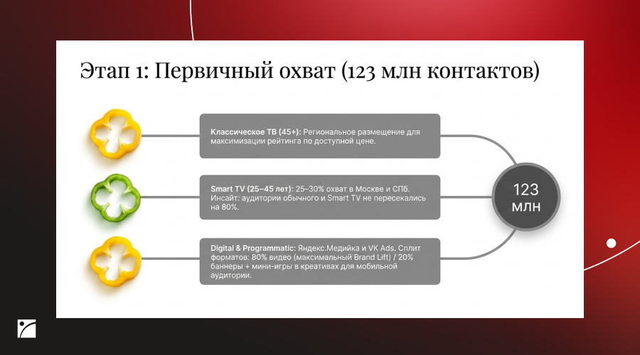 Работа началась с глубокой оценки целевой аудитории (ЦА). По всей стране насчитывалось около 83 миллионов покупателей продуктов питания в возрасте от 25 до 65 лет. Ядром аудитории выступали люди 35–55 лет, а дополнительными сегментами — 25–34 года и 55+.