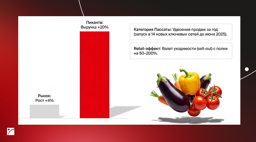 Бренд «Пиканта» был широко представлен в офлайн-рознице и сетях по всей России. Однако, несмотря на исторически сильные позиции некоторых товаров (например, икры из кабачков), компания росла лишь вместе с общим рынком овощной консервации — не более чем на 3–4% в год.