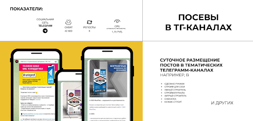 Telegram-посевы позволили точечно работать с аудиторией в строительной и DIY-тематике. Кампания обеспечила охват 42,8 тыс. пользователей при стоимости просмотра 1,75 ?, а также органические репосты, что усилило распространение контента и увеличило количество касаний с продуктом.