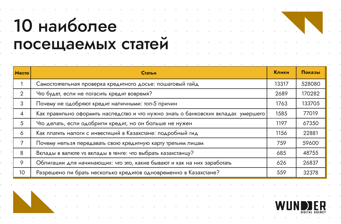 За семь месяцев работы с блогом команда Wunder Digital опубликовала 63 статьи, которые дали более 32 425 переходов из органического поиска и 285 упоминаний в Google AI. Системный подход к качеству контента позволил добиться высокой плотности в выдаче: 83% всех материалов блога стабильно удерживаются на первой странице Google, занимая позиции в ТОП-10.