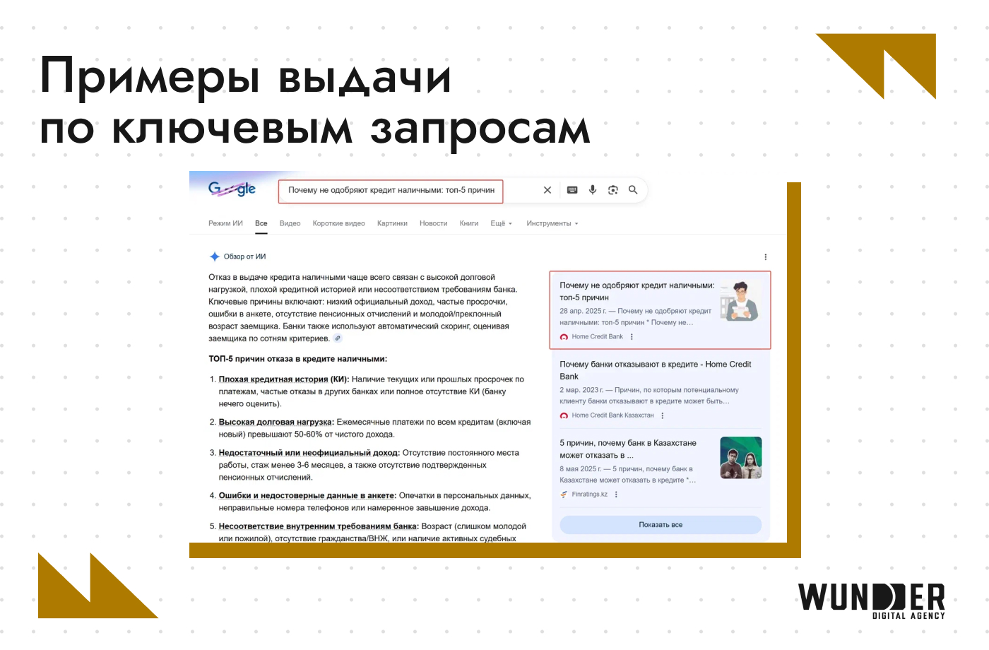 Даже сайты с огромным общим количеством проиндексированных страниц могут проигрывать Home Credit Bank в генеративном поиске, если их контент не структурирован под информационные запросы пользователей.