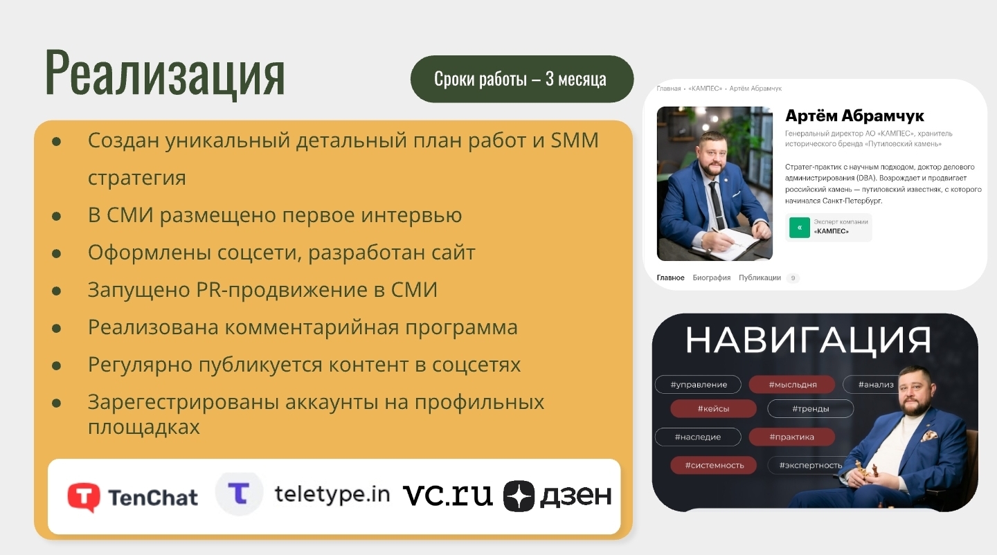 Работа над личным брендом была выстроена как последовательная система — от аналитики до медийного усиления. Проект реализован за 3 месяца.