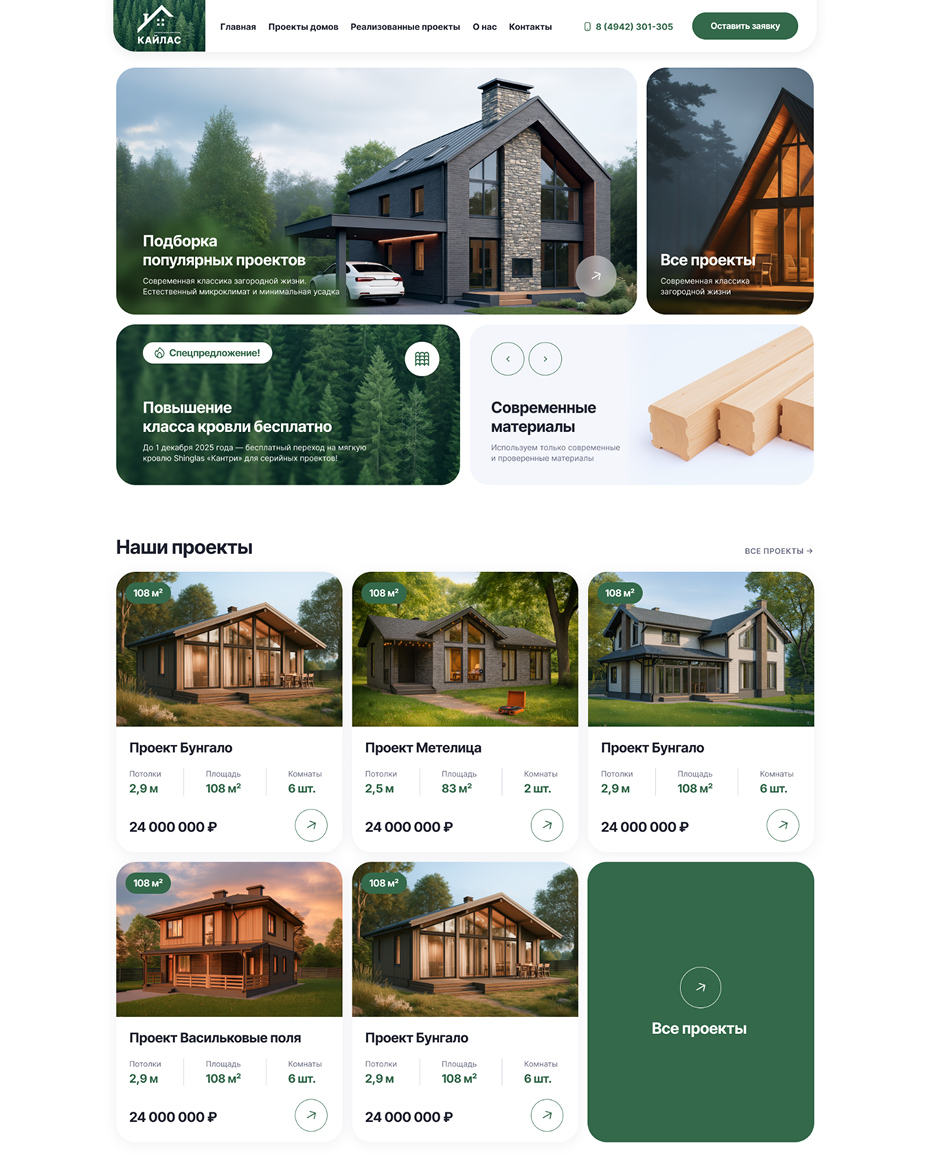 В этом проекте каталог работает не как обычная галерея, а как полноценный инструмент выбора: благодаря категориям и фильтрам пользователь может быстро сравнить проекты по ключевым параметрам. Карточка каждого проекта выполняет роль посадочной страницы — в одном месте собраны комплектация, гарантия и понятные призывы к действию. Отдельное внимание мы уделили контуру доверия: отзывы, реализованные проекты и гарантийные блоки остаются заметными и легко доступными на всех этапах взаимодействия. Вся структура сайта выстроена по логике «вдохновение ? выбор ? заявка», что снижает лишние барьеры для пользователя и помогает повышать конверсию.