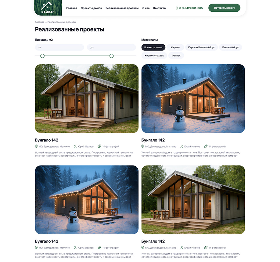 Добавили и усилили раздел с реализованными проектами, чтобы показать реальные объекты и укрепить доверие. Для строительной тематики это один из самых сильных доказательных блоков. Каждый реализованный проект – это галерея фотографий с отсылкой на проект дома.